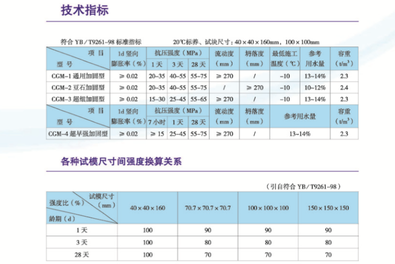 技術指標 符合YB/T9261-98標準指標 20℃標養(yǎng)、試塊尺寸:40×40×160mm,100×100mm