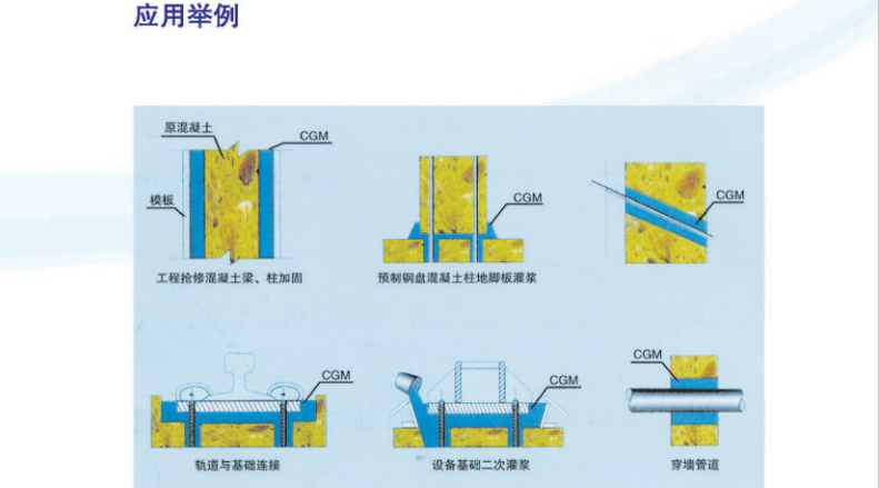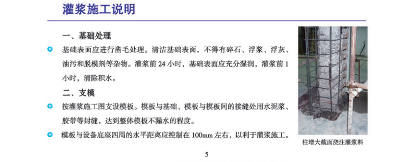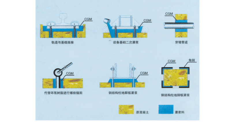 灌漿厚度30mm<δ<150mm設備基礎二次灌漿,地腳螺栓錨固,栽埋鋼筋,建筑物梁、板、柱、基礎和地坪的補強加固。